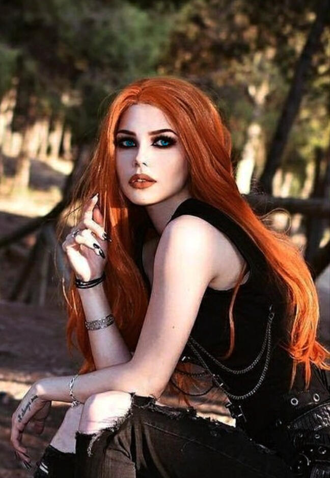 Kyra's almost alabaster-colored skin has a soft rose color. Her long white hair, which reaches down to her mid-body, is one of her most striking features, along with her turquoise blue eyes. Her figure is athletically slim, almost graceful. Kyra prefers to wear black clothing in the Gothic style. She is 5'7'' ft | 1.70 m tall and weighs approximately 143.3 lb | 65 kg.